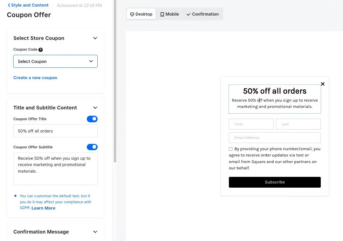 Square's Coupon Pop-Ups let you share special offers with your visitors right when it matters most. Choose from the same user-friendly layouts as the email pop-ups (Layout #1-#4 are available) and create consistent campaigns.