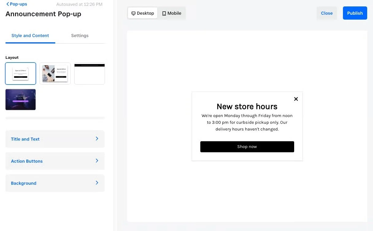 Keep your customers informed and engaged with Announcement Pop-Ups. Choose from layouts #1-4 (without the email fields) and customize them to share: