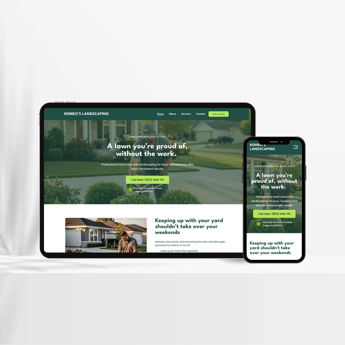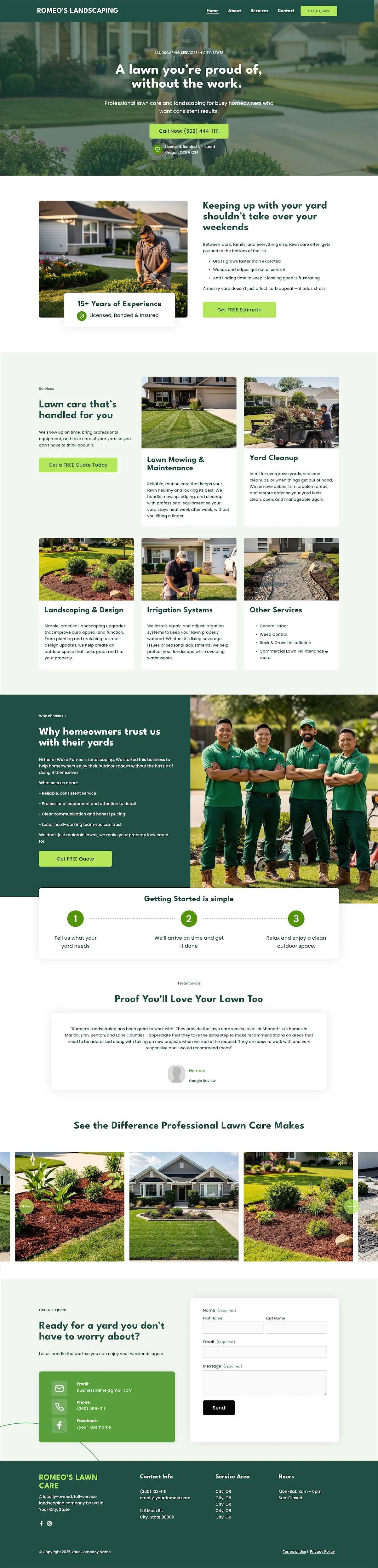A one-page Squarespace landscaping website template designed to help lawn care and landscaping businesses get online fast and look professional from day one.